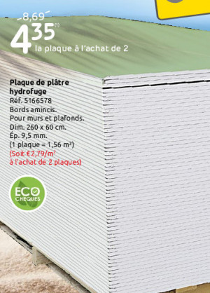 Découvrez l assortiment de gyproc chez hubo. Plaque de plâtre verte de 260x120 cm hydrofuge et à bords biseautés d une épaisseur de 12 5mm knauf plaque de plâtre hydrofuge hrk 12 5mm 260x120 cm hubo il n y a pas de javascript sur cet appareil veuillez modifier vos réglages ou utiliser un autre appareil. Parachevementshop est le spécialiste pour les finitions intérieures et l isolation de votre maison.
